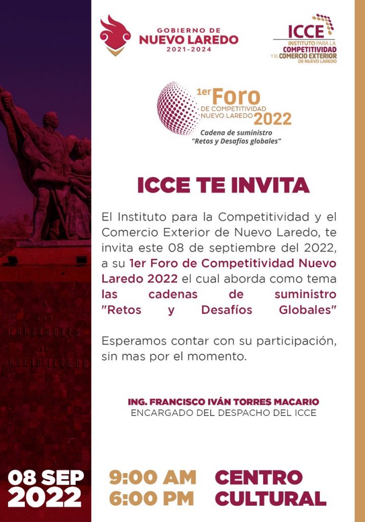 El Instituto para la Competitividad y el Comercio Exterior de Nuevo Laredo (ICCE), invita este 8 de septiembre de 2022 al